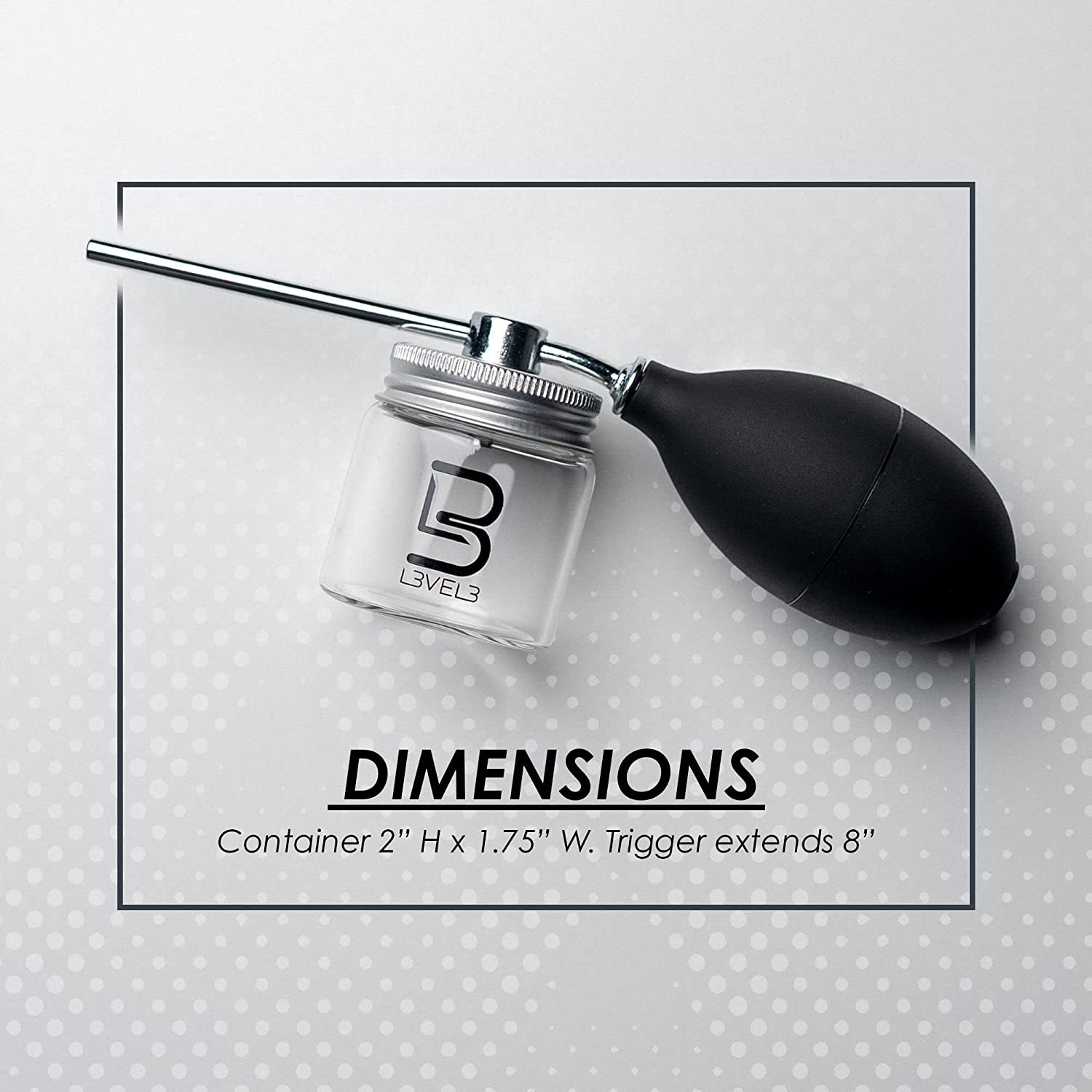 Dimensions: Container 2” H x 1.75” W. Trigger extends 8”.