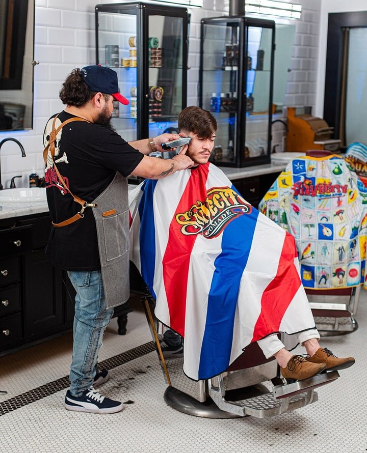 You can’t go wrong with the classic stripes of the Barber Pole Cape. Your clients will look and feel great while getting cleaned up. The elastic neck and hook fit comfortably on each person who sits in your chair, while the extra long length keeps them free from stray hairs.